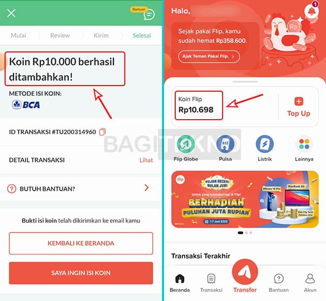 Itulah cara top up saldo Flip dengan mudah menggunakan rekening bank. Silahkan anda melakukan cara ini jika ingin menggunakan saldo atau koin Flip tapi tidak cukup, sehingga harus diisi ulang terlebih dahulu. Setelah melakukan top up, maka anda sudah bisa langsung menggunakan semua koin Flip tersebut.