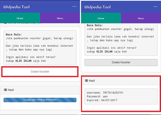 - Tunggu beberapa menit sampai muncul hasil berupa username, password dan tanggal expired dari voucher (akun) tersebut.