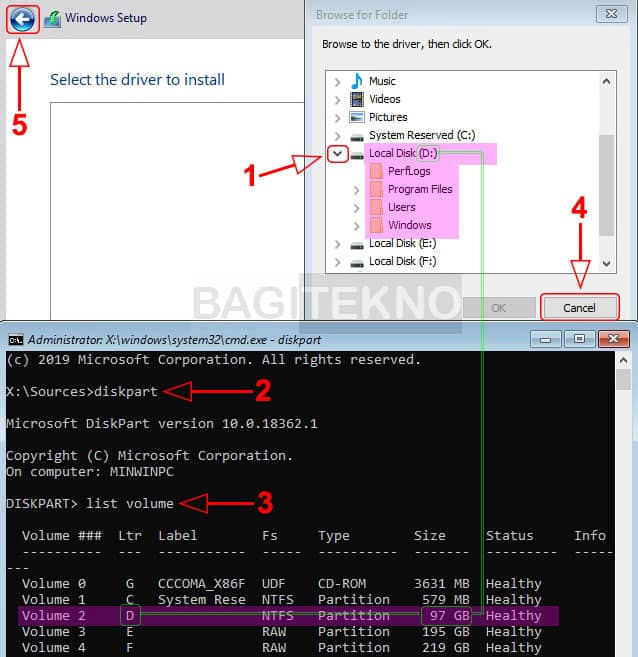Setelah mengetahui ukuran partisi Windows yang harus anda hapus, maka silahkan kembali ke halaman pemilihan partisi. Silahkan klik Cancel pada jendela Browse for Folder kemudian klik tombol kembali di sebelah kiri tulisan Windows Setup.