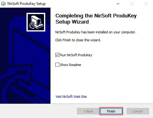 Jika proses install sudah selesai, maka anda sudah dapat menggunakan software ini untuk melihat product key Windows yang terpasang pada Laptop anda. Pada jendela yang muncul silahkan centang pada checkbox Run NirSoft ProductKey lalu klik Finish untuk menutup jendela setup dan langsung menjalankan software product key viewer yang pertama ini.
