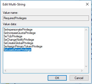 Pada halaman edit string tambahkan SeLoadDriverPrivilege pada Value data (simpan teks tambahan pada baris terakhir).